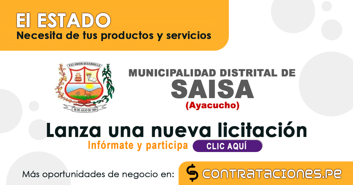 A través de esta página web te informaremos sobre las oportunidades para contratar con: MUNICIPALIDAD DISTRITAL DE SAISA.