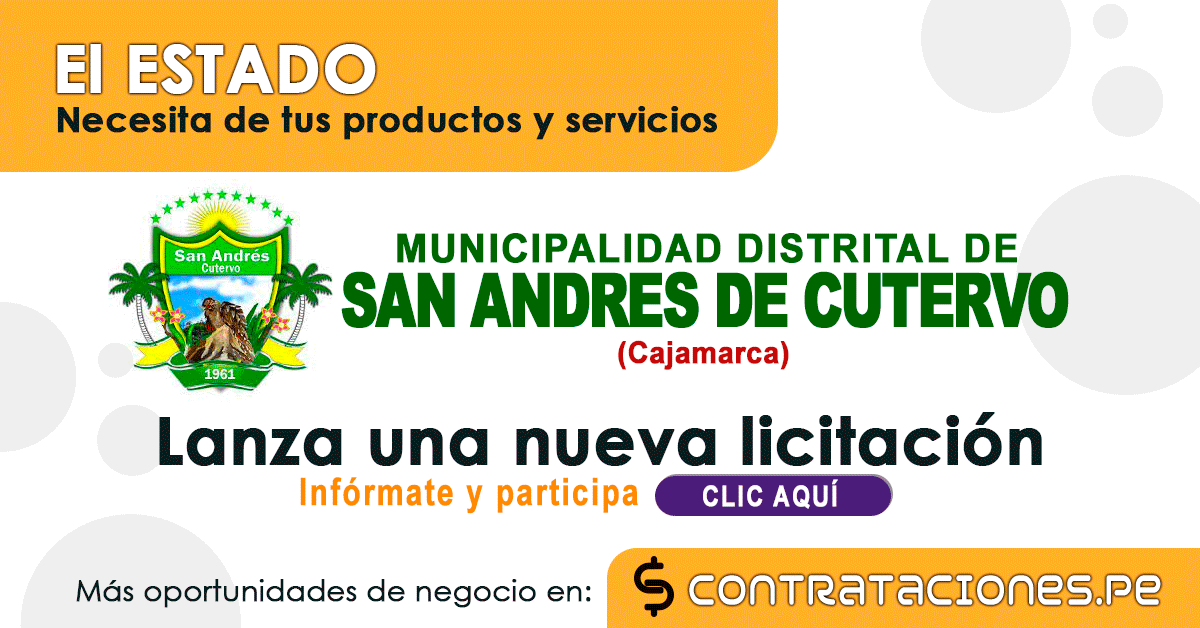 A través de esta página web te informaremos sobre las oportunidades para contratar con: MUNICIPALIDAD DISTRITAL SAN ANDRES DE CUTERVO.